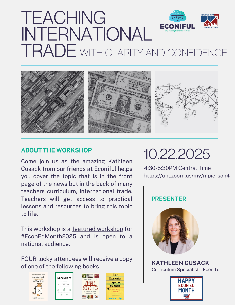 Come join us as the amazing Kathleen Cusack from our friends at Econiful helps you cover the topic that is in the front page of the news but in the back of many teachers curriculum, international trade. Teachers will get access to practical lessons and resources to bring this topic to life.
